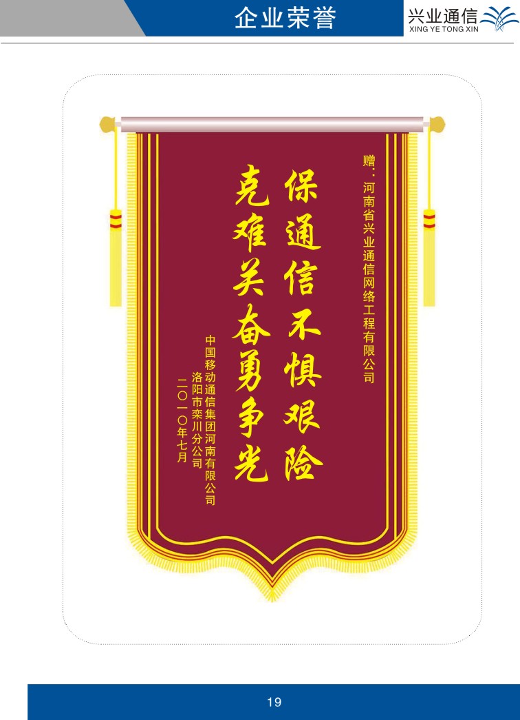 中国移动通信集团河南有线公司洛阳市栾川分公司颁发锦旗